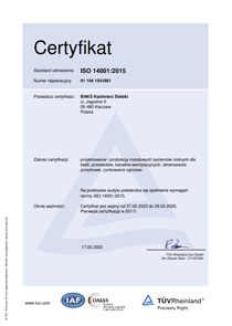 Certyfikat dot. systemu zarządzania środowiskowego ISO 14001 2015