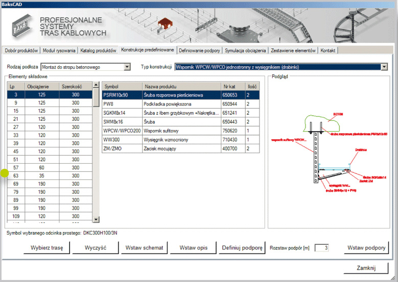 Możliwość wprowadzania do projektu podpór tras kablowych oraz definiowanie elementów podpór na dwa sposoby. Za pomocą pojedynczych detali wybieranych z wszystkich dostępnych elementów katalogowych lub poprzez wykorzystanie konstrukcji predefiniowanych skompletowanych dla odpowiedniego typu trasy kablowej. Dodatkowo szybkie wstawianie do projektu opisów elementów składających się na podporę i schematycznych przekrojów podpór dla konstrukcji predefiniowanych.