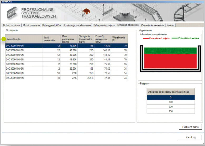 Kontrola każdego wrysowanego odcinka trasy kablowej pod względem obciążenia i wypełnienia, po uzbrojeniu tras kablowych w podpory oraz przebiegi kablowe program wskazuje ewentualne przepełnienie lub przeciążenie